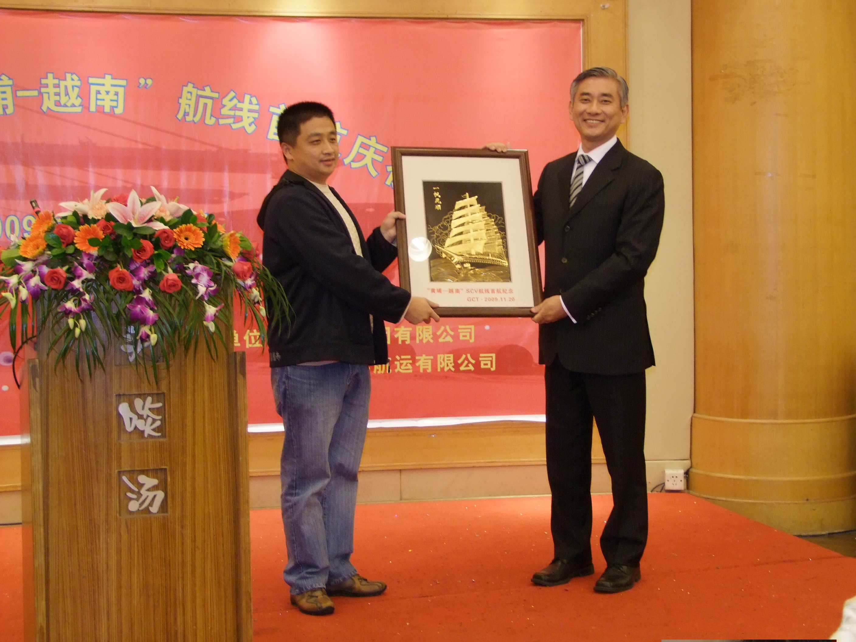 (王绍良总经理向泛洋首航轮船长赠送纪念品)